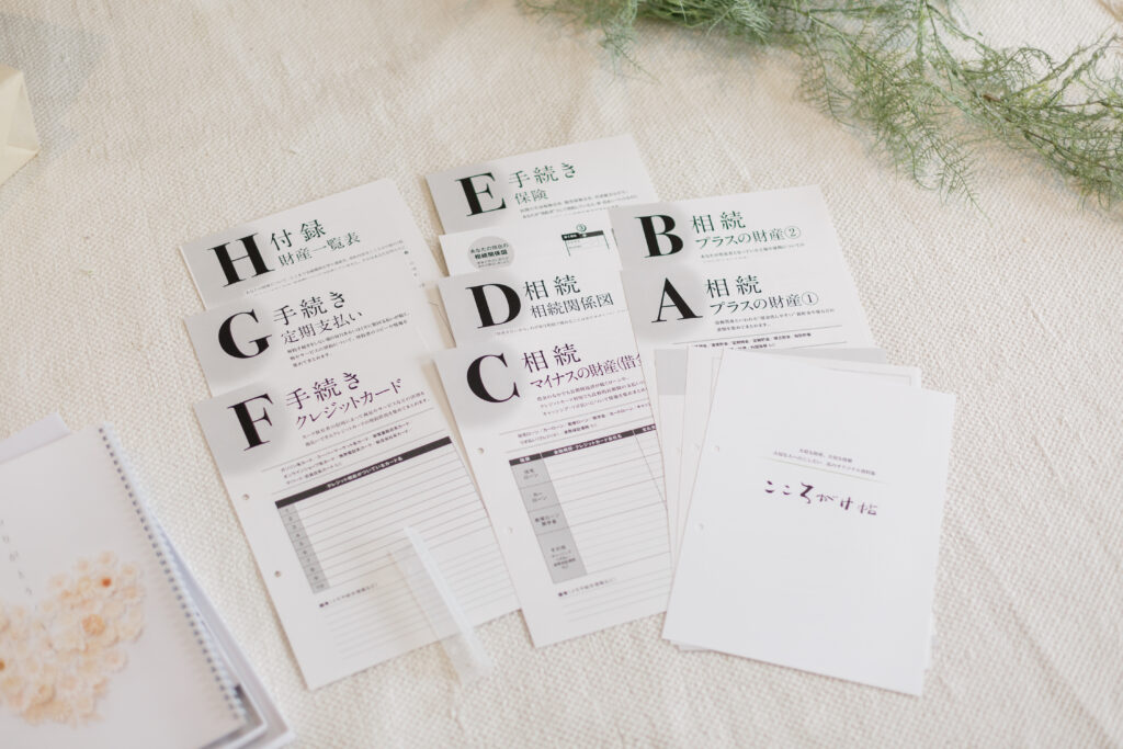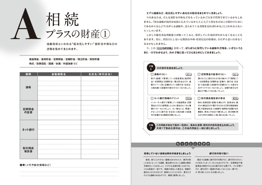 預金や株式、土地、借金(ローン)などの財産、保険や定期支払いなどの契約について、それらがどのような状態になっているか分かるもののコピーを集め、穴を開けて閉じ、最終的にはあなたの財産の状況がまとまっているオリジナル資料集を作ります。これがあれば、あなたが急に入院したり、介護施設に入所したり、亡くなったりした際に、ご家族に役立ちます。そして実は、このこころがけ帖を作ることは、あなたご自身のためにもなるのです。